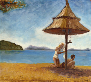The artist claimed that his inspiration for this masterpiece was an advertisement he saw in a Sunday colour supplement - an advert for a saucy fortnight in Torremolinos. Part of this was probably true. Certainly there was no one in his life with thighs that thin - nor hair that yellow. Yet notice that the male figure in the picture is totally disinterested in this raving beauty. His eyes are fixed in the near distance - to where a vendor of kosher fish products has set up a stall. Amidst the tropical paradise and sensual presence of this daffodil-haired temptress - all this stud can think of is a small morsel of chopped carp and pike - lightly battered in matzoh meal and deep fried to a golden hue. Such is the duality of man's existence....